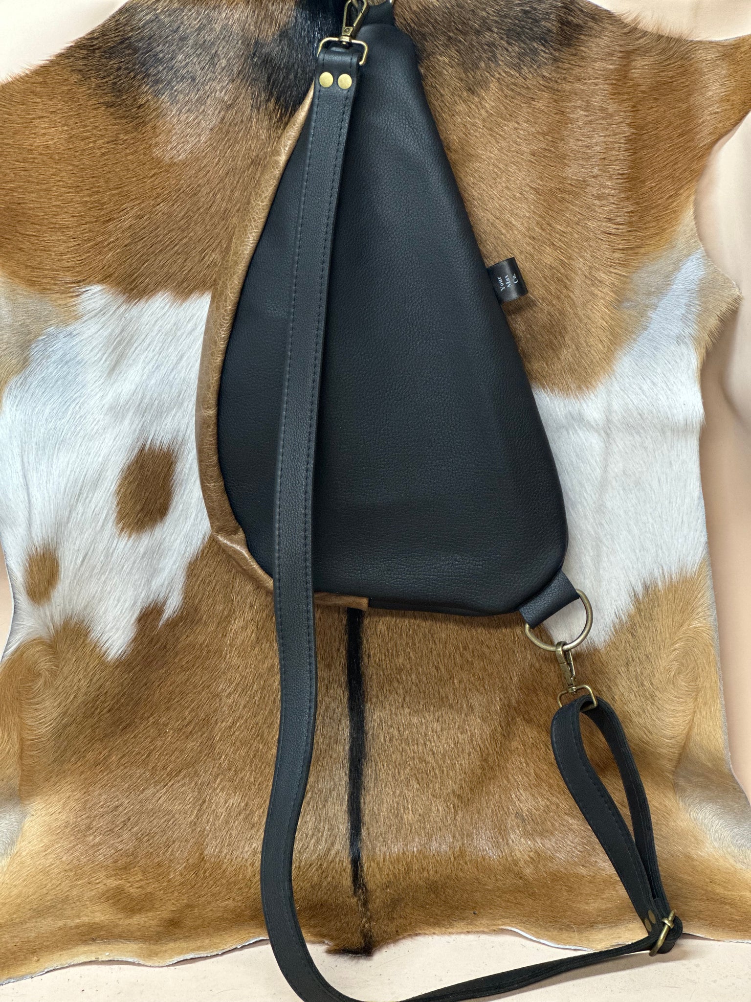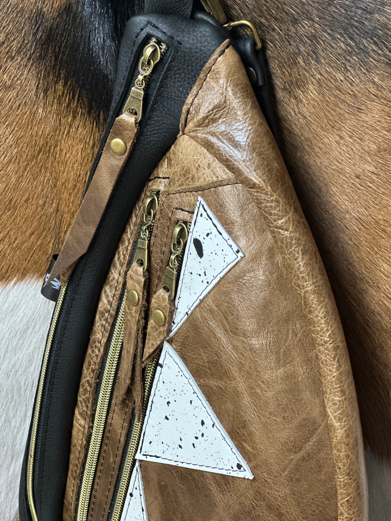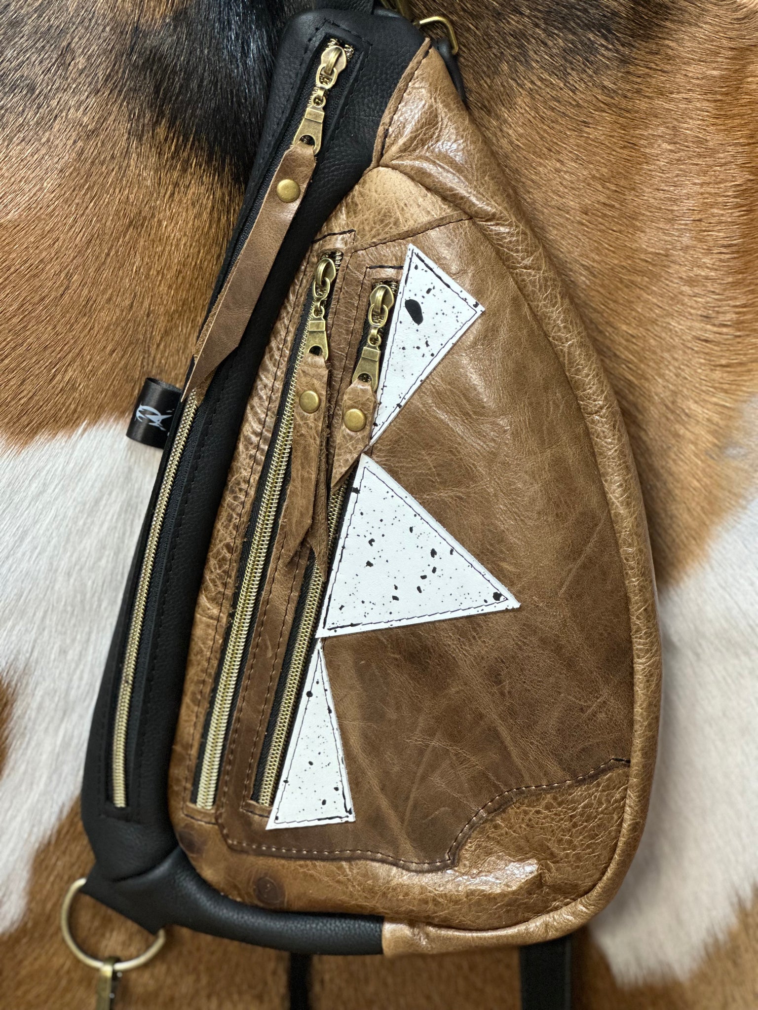 WOW you’ve gotta see it and feel it! Black leather sling bag with russet brown front pockets. Black and white leather splattered front accents. 3 total zippered compartments. Antique brass hardware. Zipper pulls on all of the zippers. Adjustable crossbody strap.