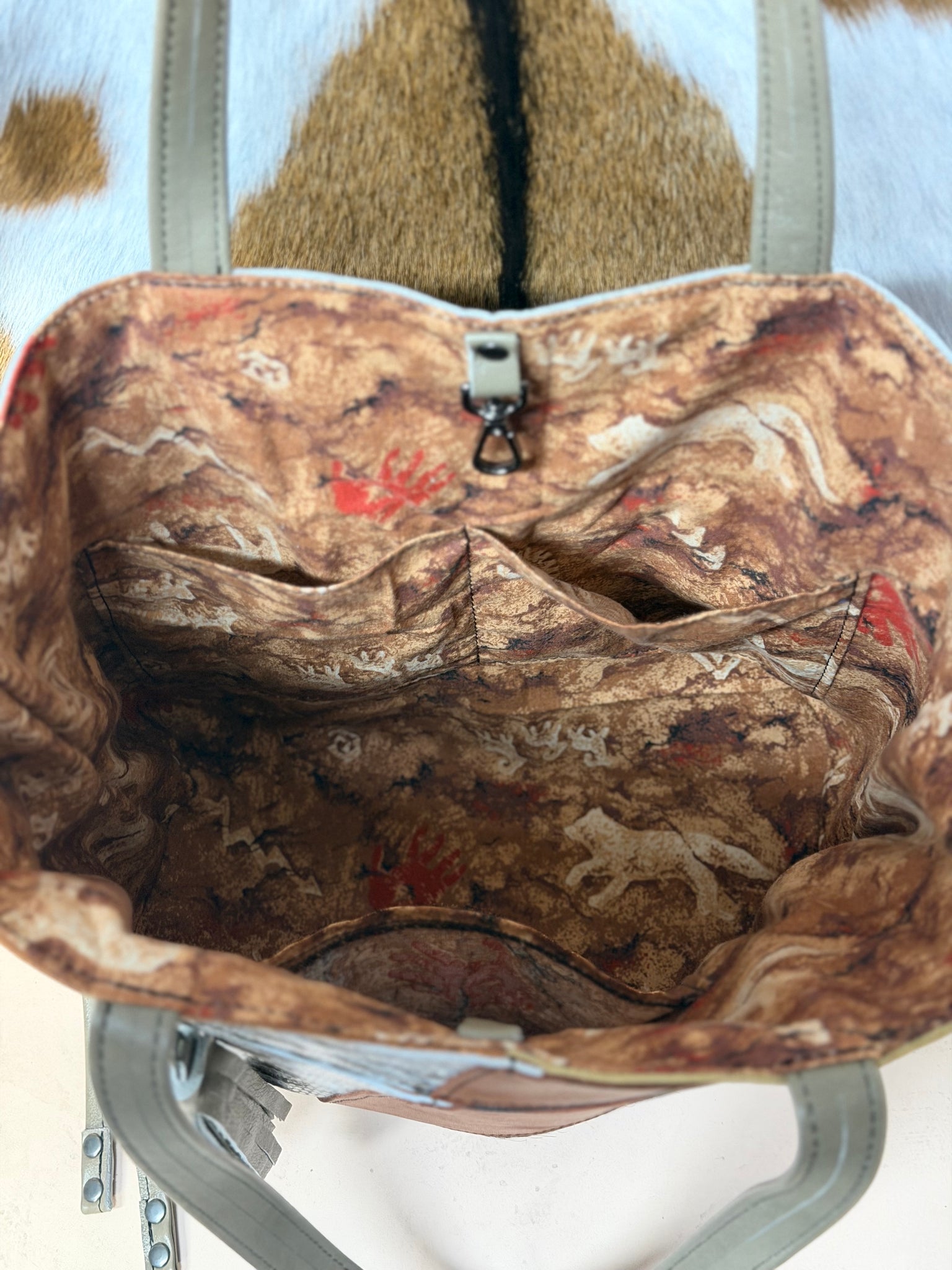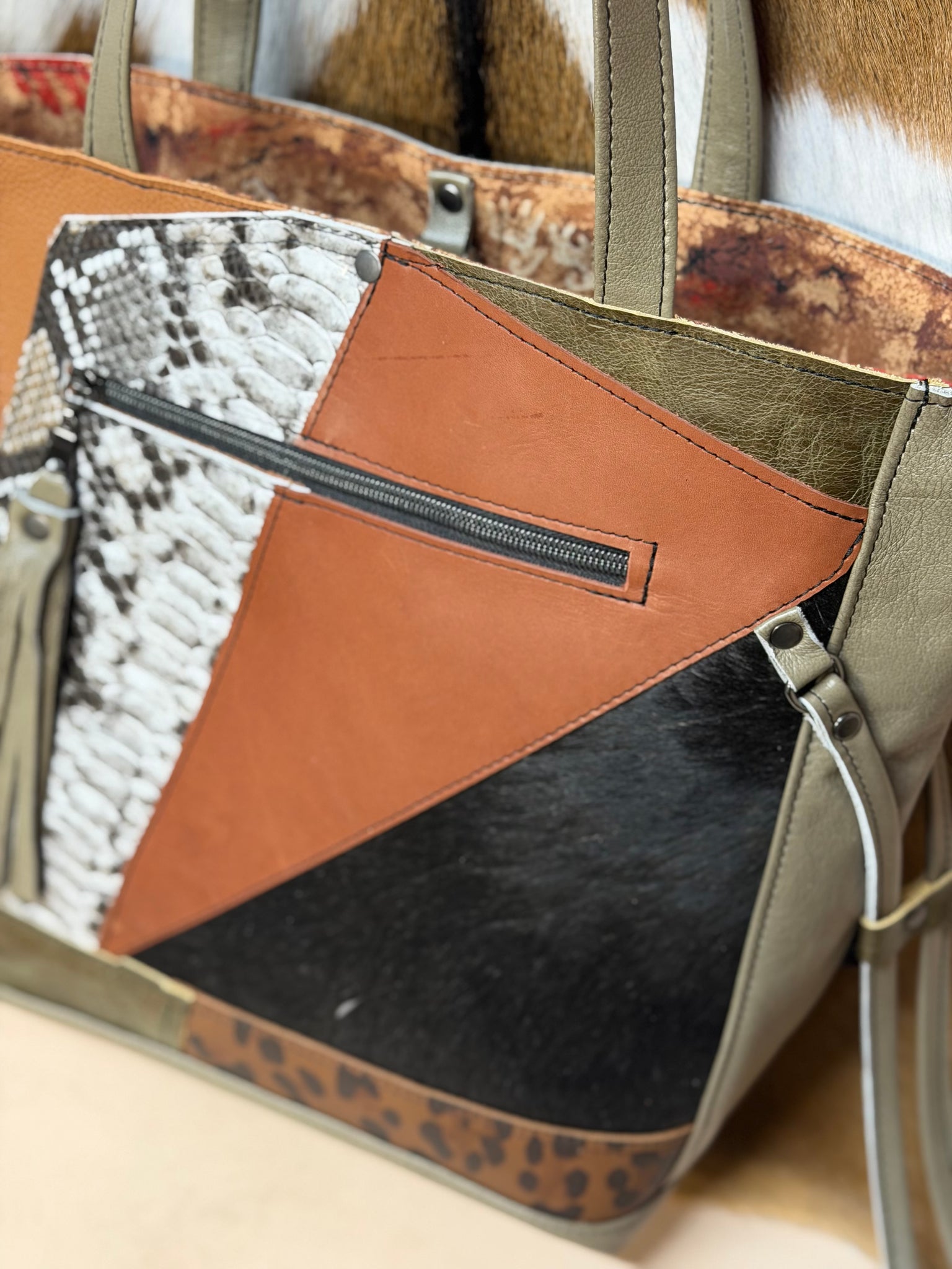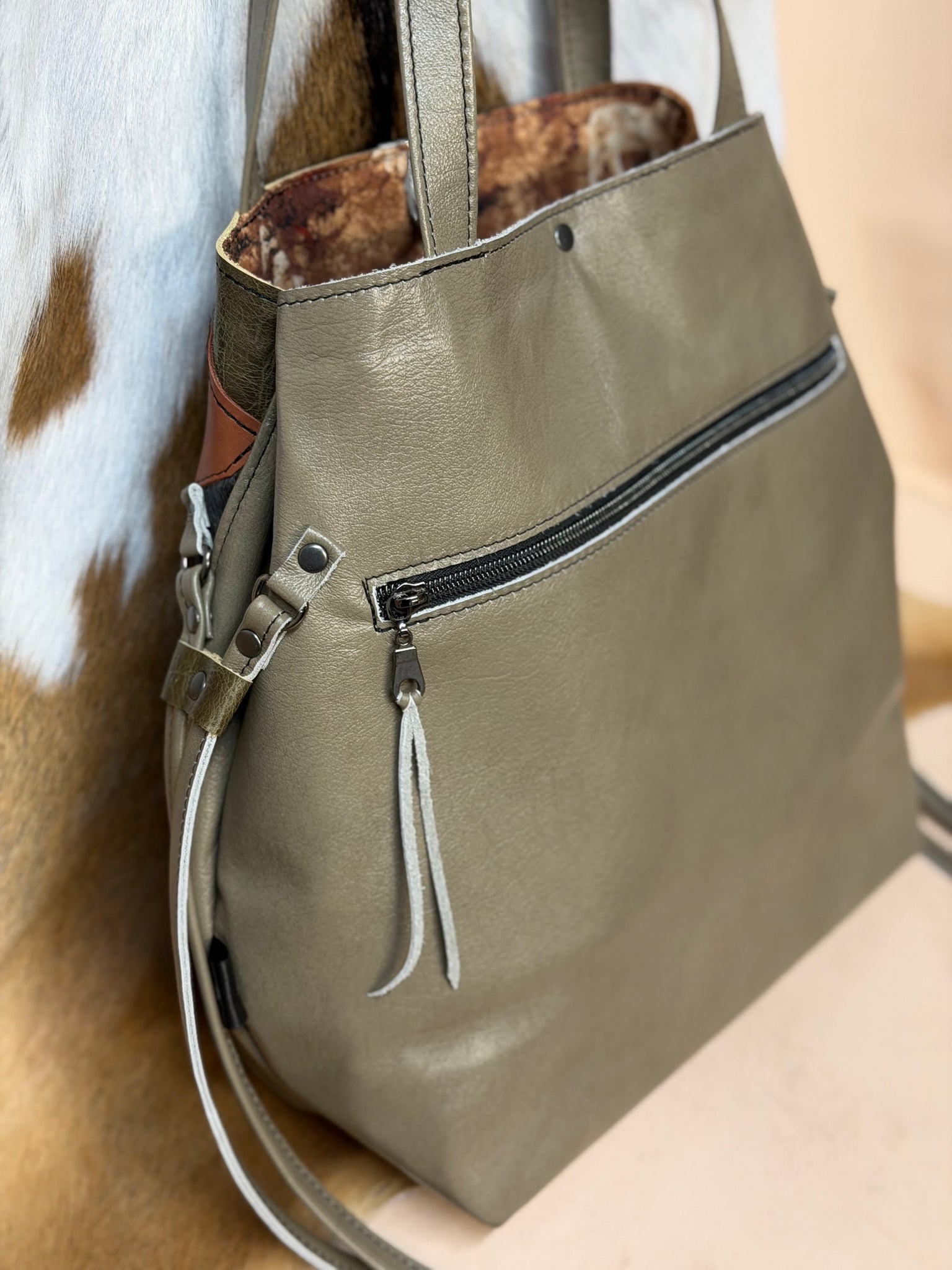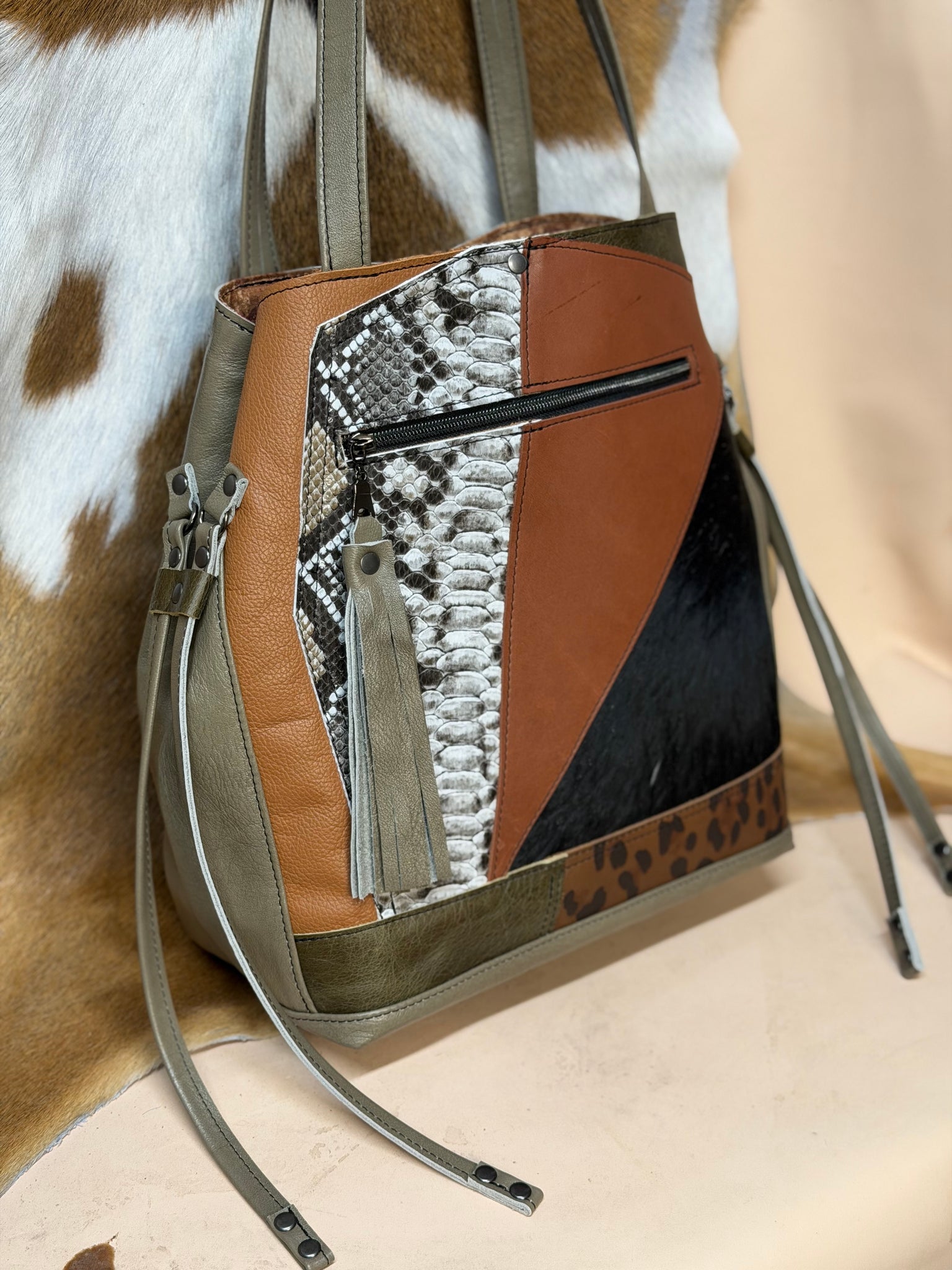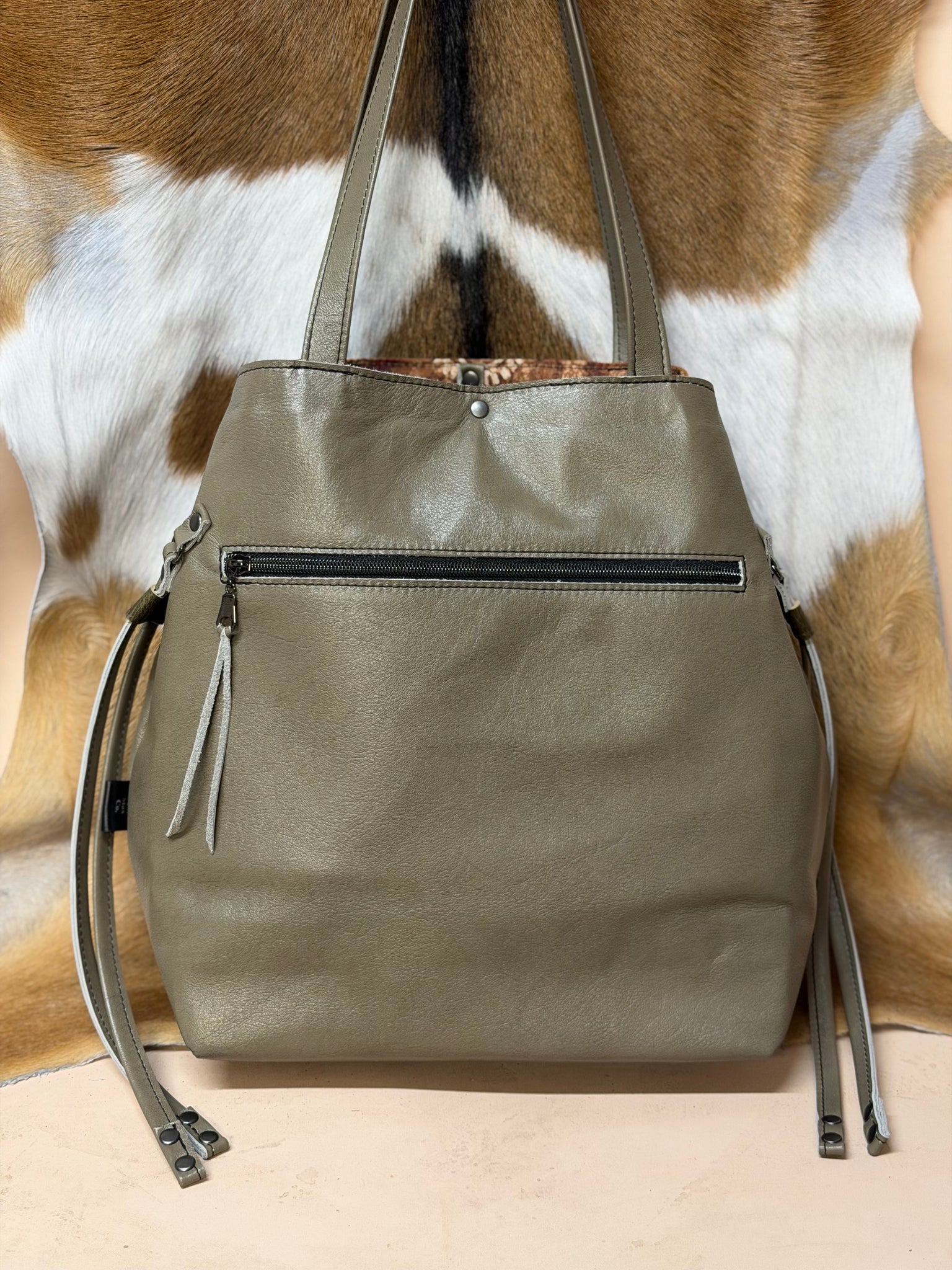 Stunning Sanford is back! Basil green leather with tan, leopard, black and more as front accent pieces. 3 inside slip pockets. Fully lined interior. Clip and ring closure on mouth of bag. Front zip pocket. Large backside zip pocket on outside. Side drawstrings if you want to bring the mouth in (like pictured) or keep them out.
