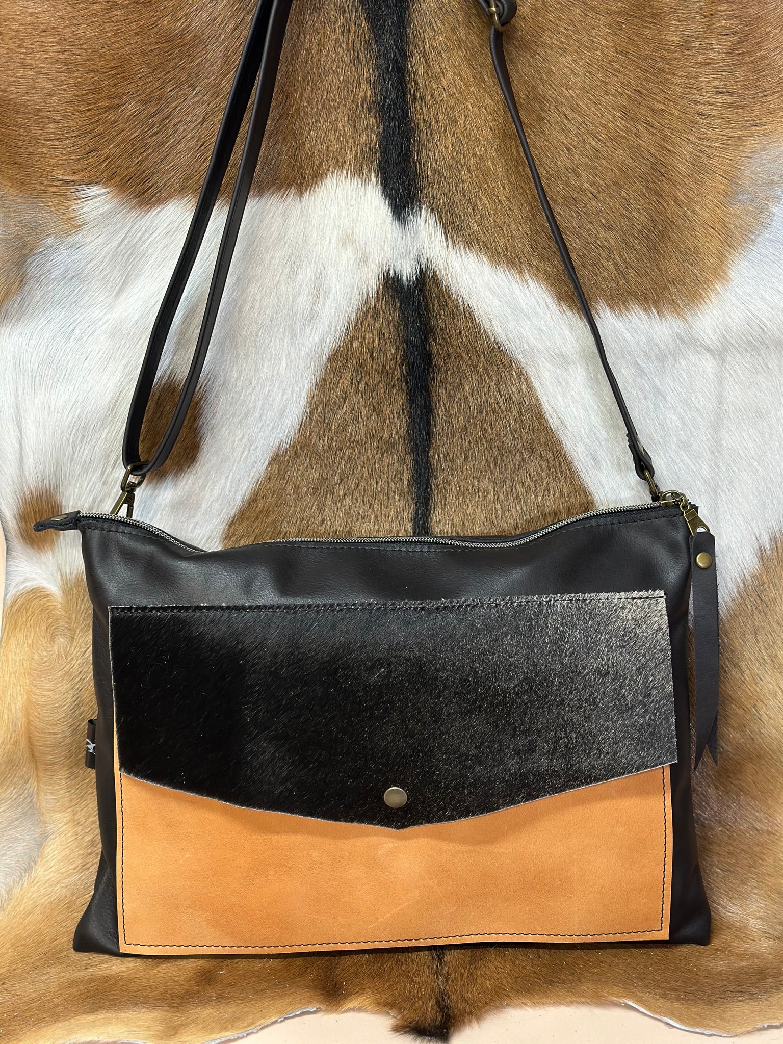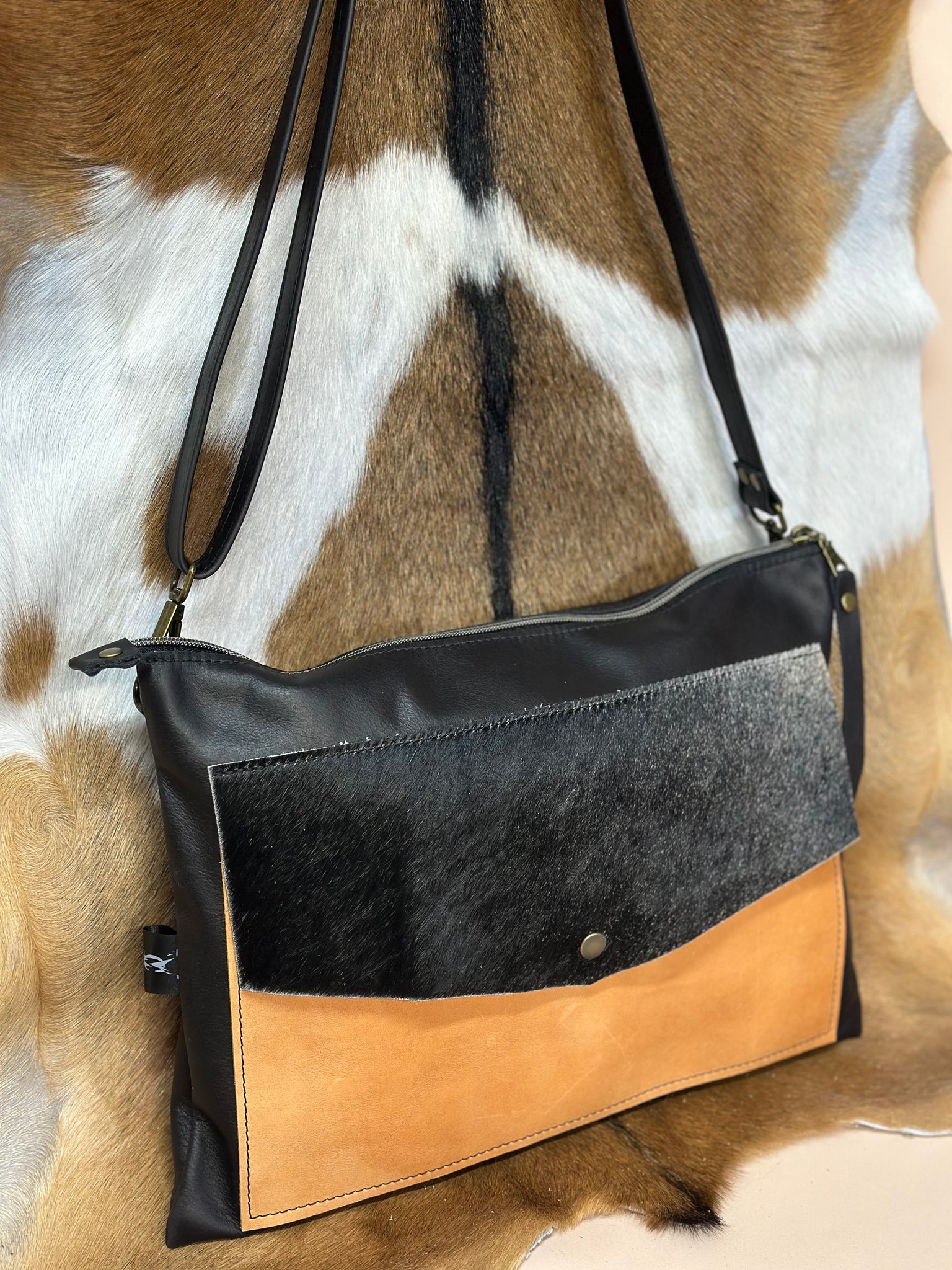 Beautiful and so soft you won’t believe it! Black Coal leather crossbody with tan front pocket with black ombré hair on cowhide flap. Antique brass hardware, zip closure and snap. Adjustable and removable crossbody strap. One inside slip pocket.