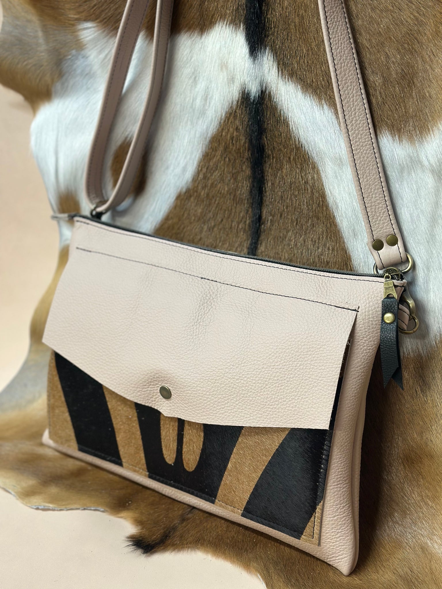 Stunning in person! Pale pink, almost nude pebbled leather crossbody with large printed tiger stripes front pocket. Matching pebble leather flap to bag. Antique brass hardware. Snap closure on pocket. One inside slip pocket. Adjustable and removable crossbody strap. Zipper pull on closure. Leather is so thick and soft!