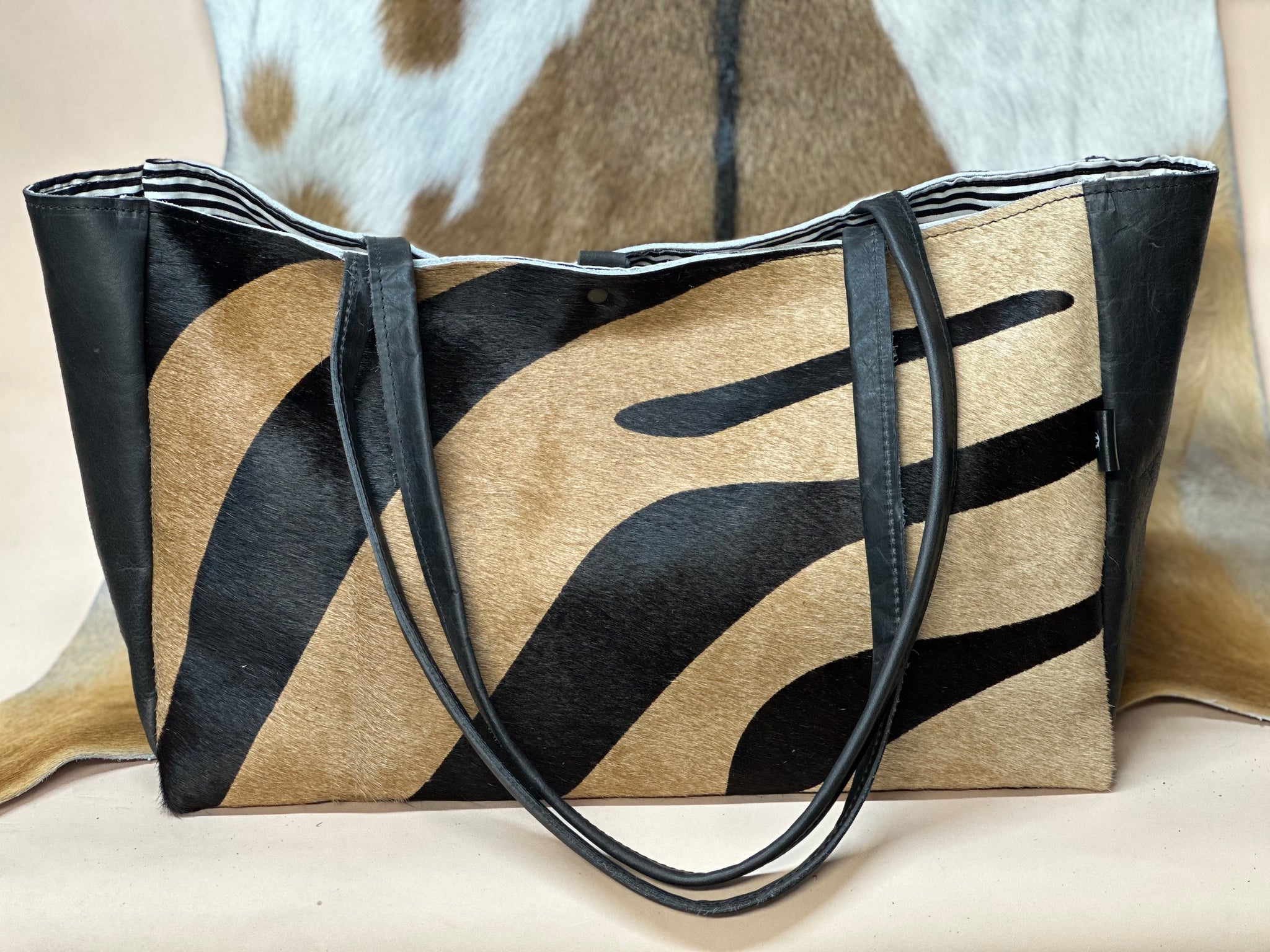 Stunning Hair on cowhide and black buffalo leather shoulder tote. Carry everything in this beauty! Fully lined interior with 2 inside slip pockets. Black Clip closure. Buffalo leather sides and shoulder straps.