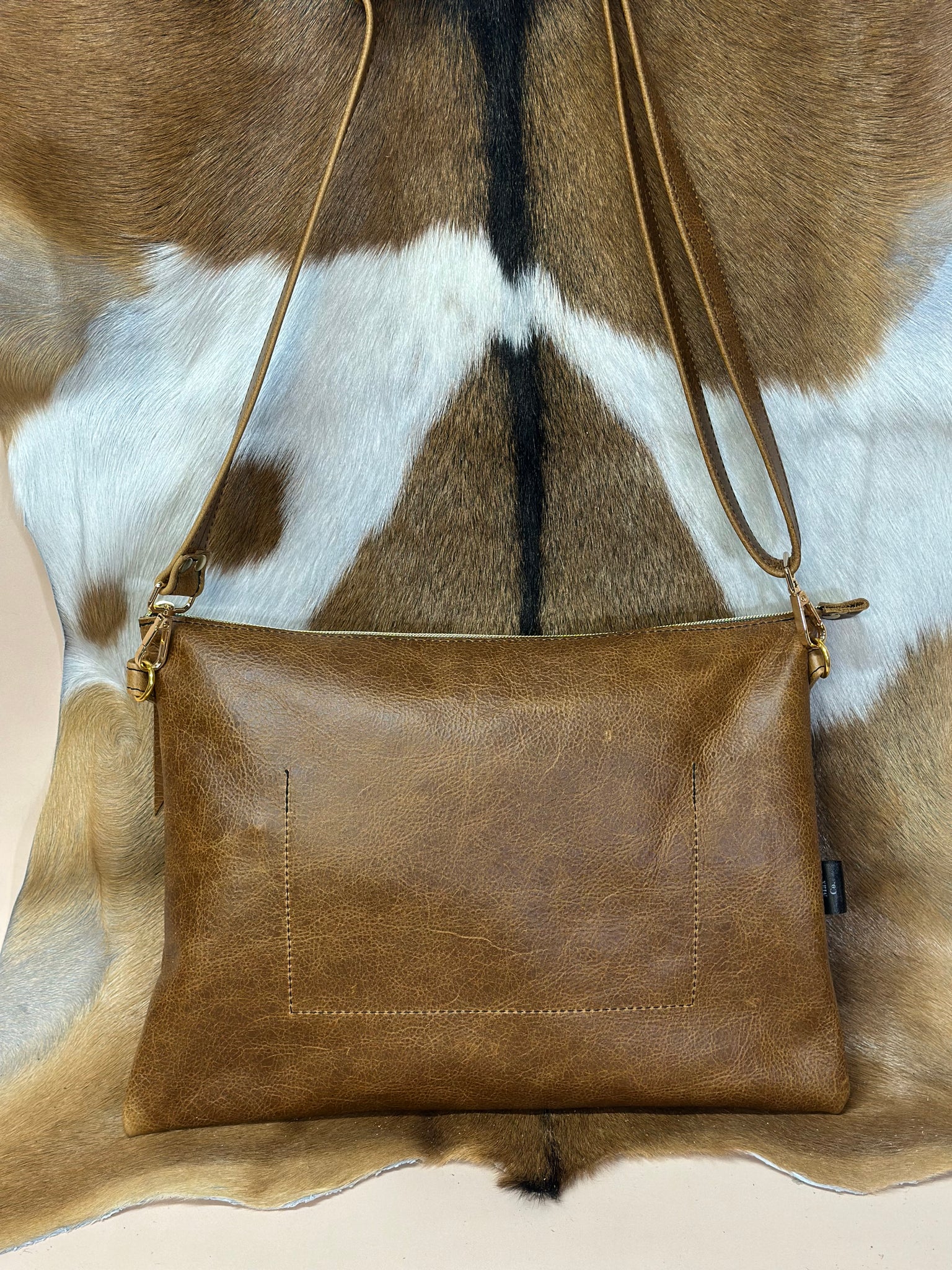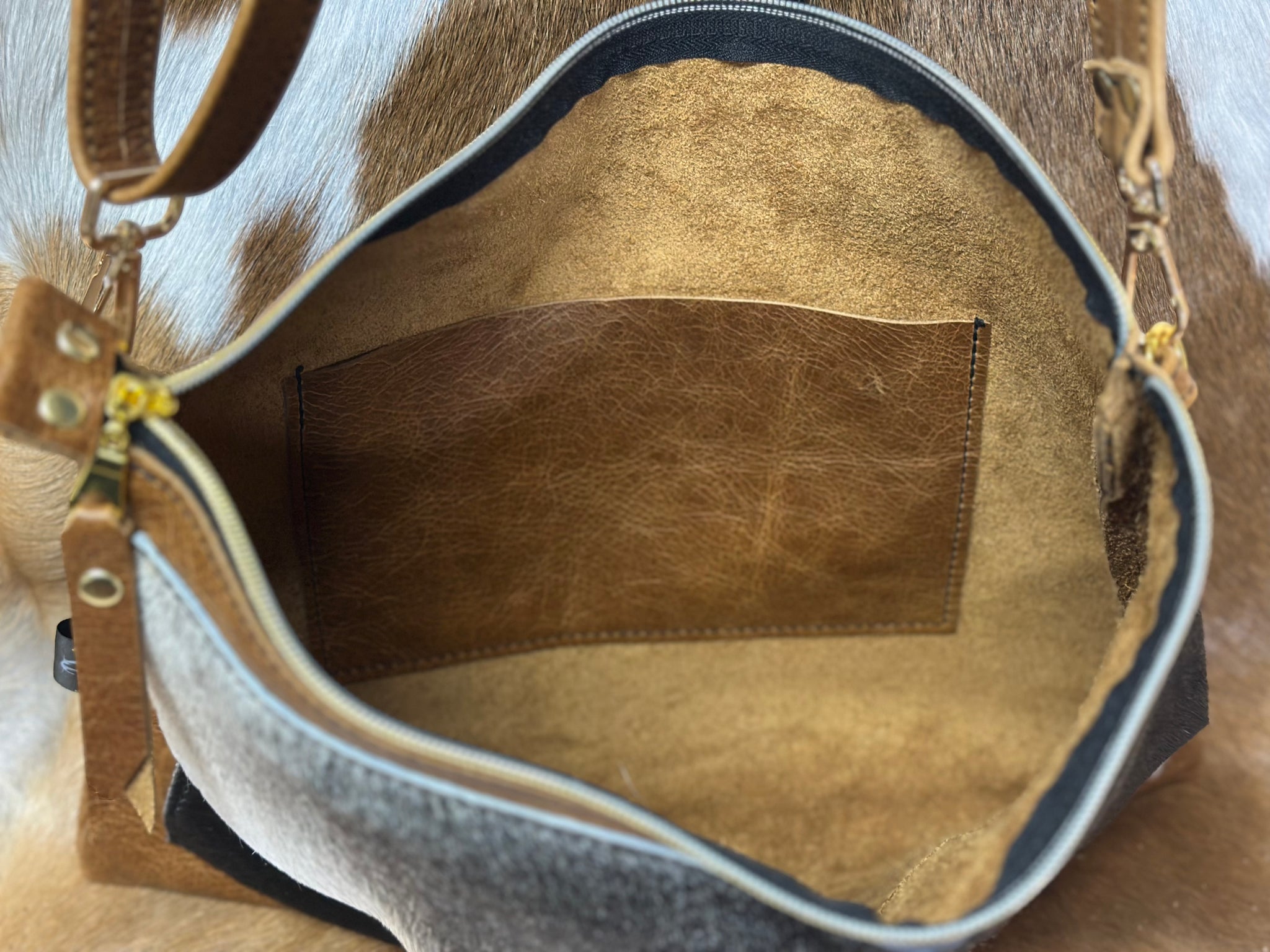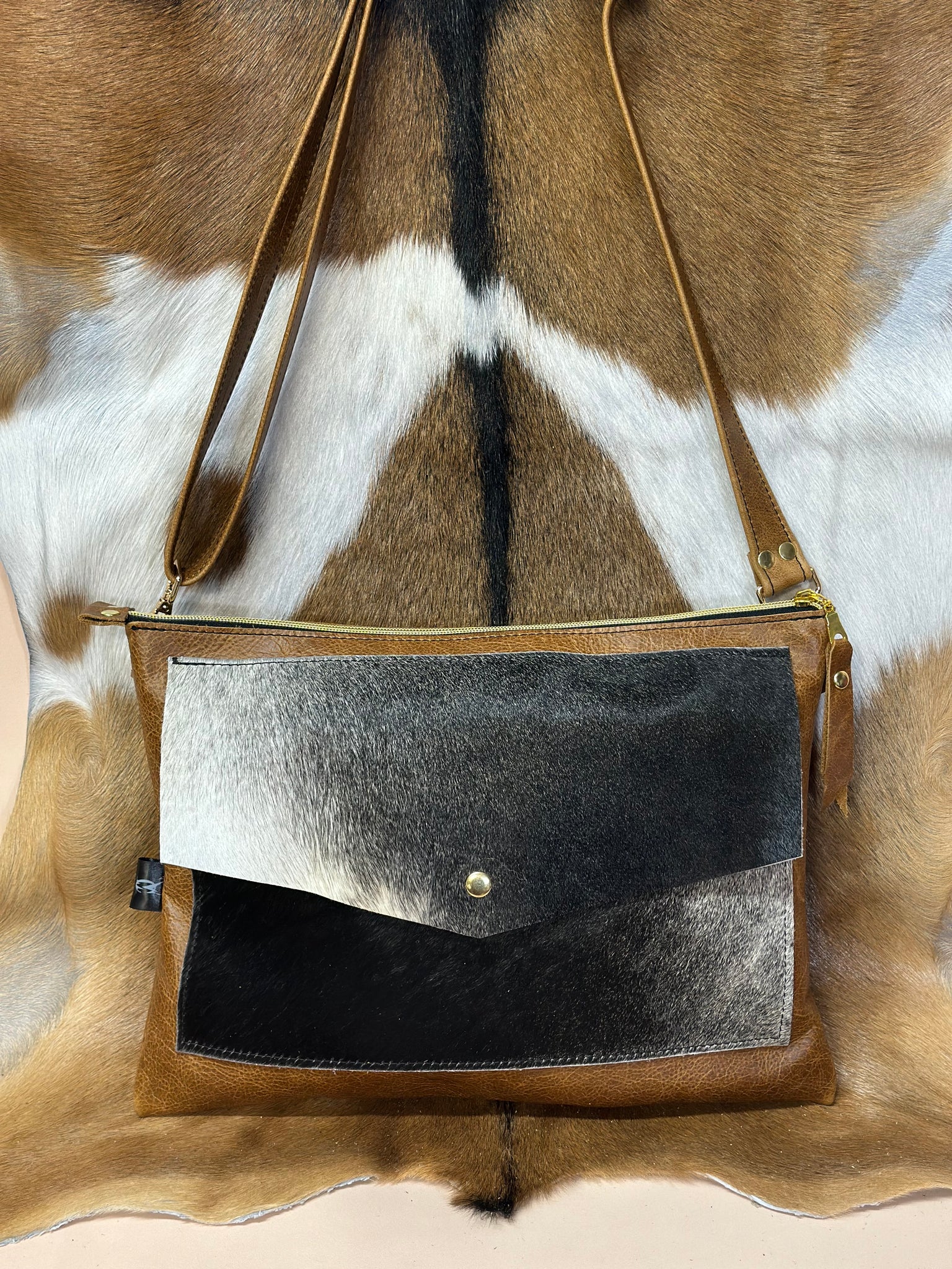 Absolutely beautiful chestnut leather crossbody with black ombré hair on cowhide front envelope pocket. Zip closure on bag. Snap closure on pocket. One inside slip pocket. Gold hardware. Adjustable crossbody strap. Zipper pull on closure. Chestnut leather will patina, rough and scruff with wear beautifully!