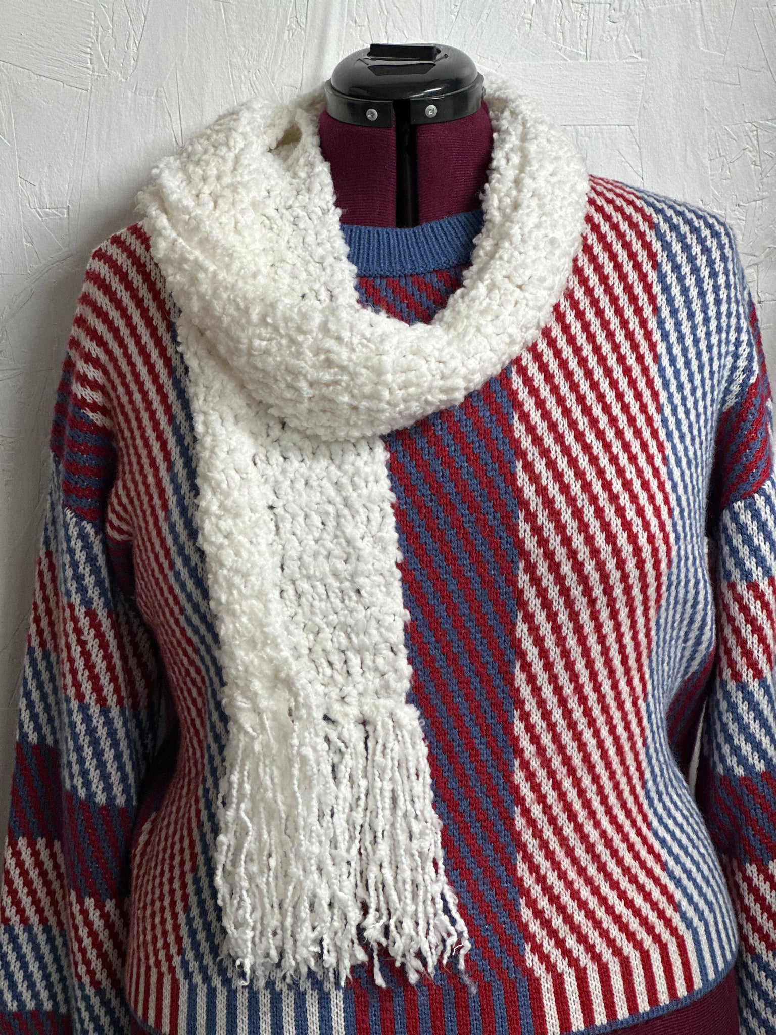Snow White and extremely soft chenille scarf! Handmade and crocheted by artisan. Nice linge fringe off the ends. This is sure to keep your warm!