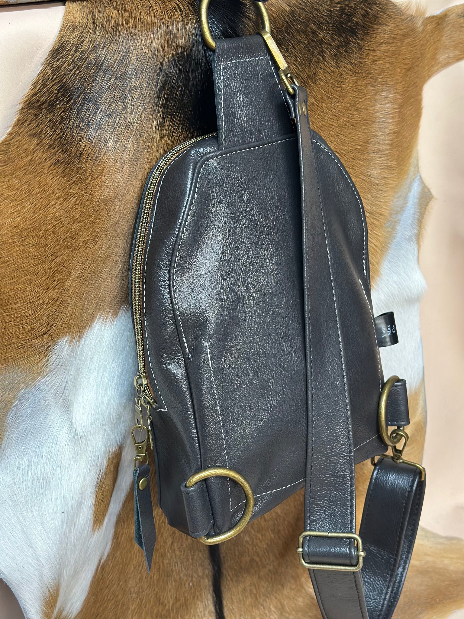 Fabulous Graphite leather vertical body bag! Chestnut and antique brass zippers with white thread for contrast. Front zip pocket. One inside slip pocket. Dual zipper head in to main body for left or right side wear. Zipper pulls on both zippers.